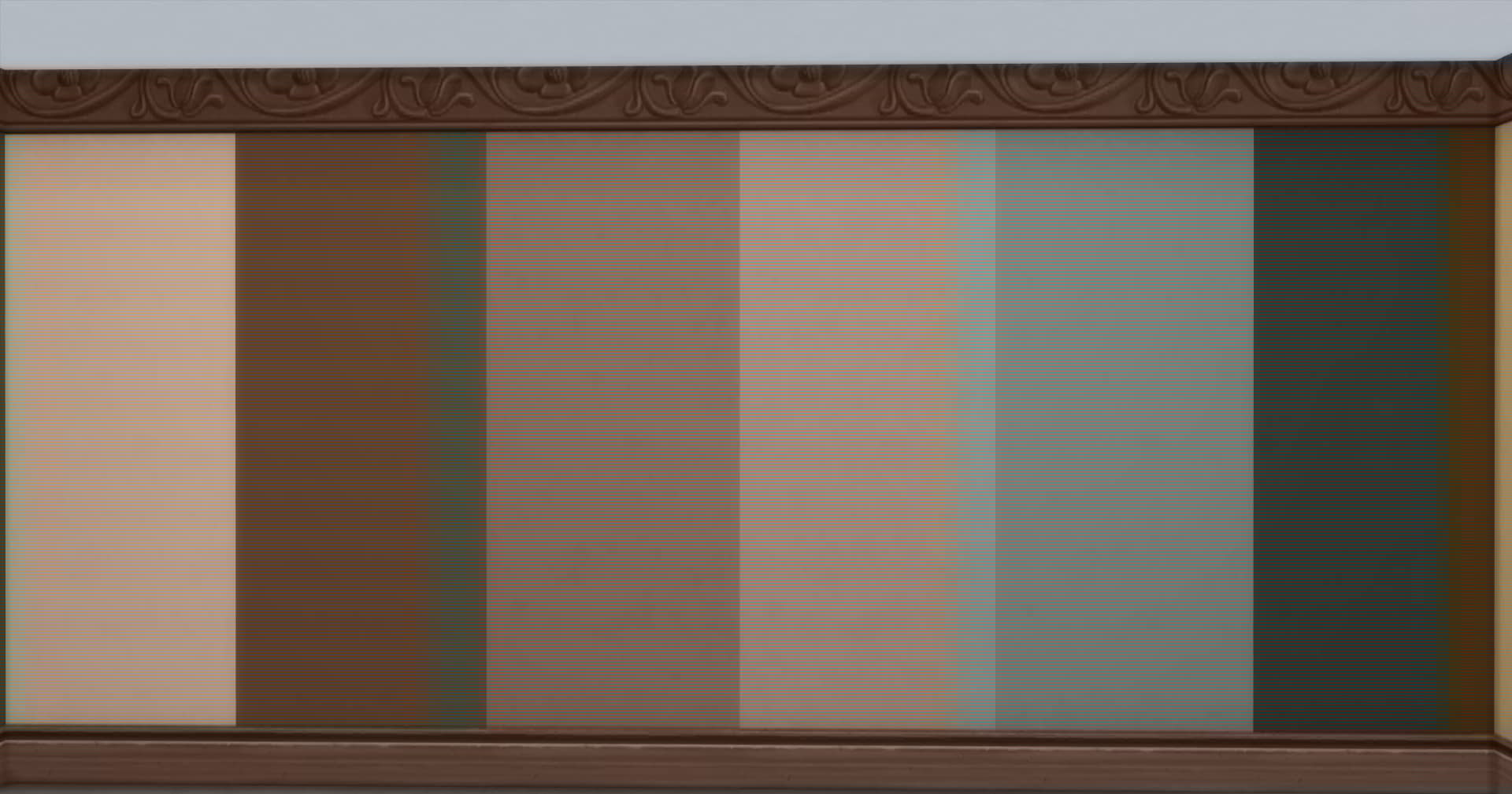 A series of walls recolored from the base game Arbor Ardor walls and Louis the Fourth paneled walls in what I am dubbing “The Revenge Palette” taken from the OFMD art director’s color choices meticulously gathered by clairegregoryau, as well as a hand drawn version of the infamous “depression robe” pattern released by lonicera-caprifolium way back in April of 2022 that I painstakingly made tileable.